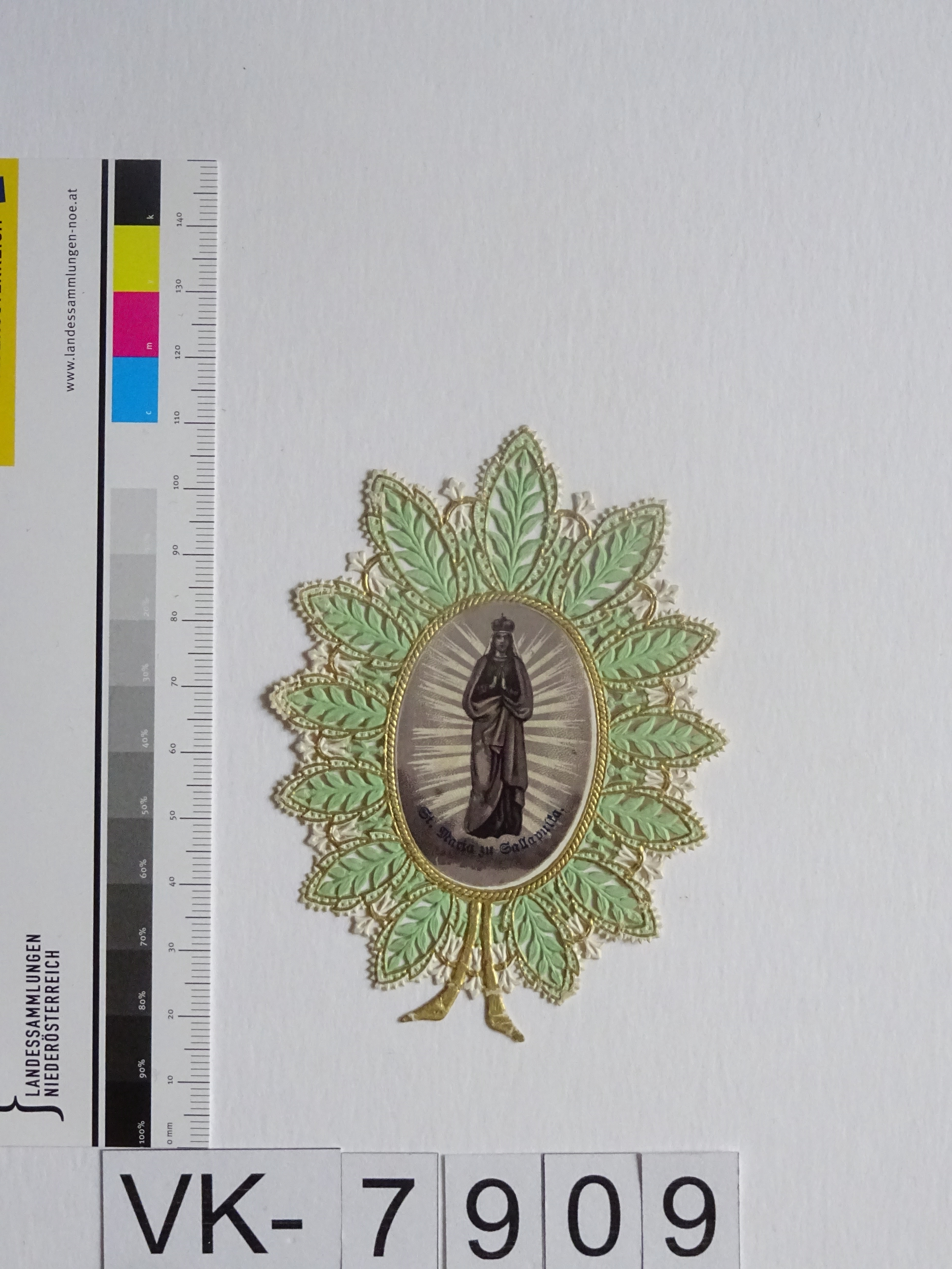 Wallfahrtsbild: Ovales Papierbild mit umlaufendem, stickmusterartigem, hellgrünem Blattdekor, einer Mariendarstellung und der Aufschrift "St. Maria zu Sallapulka". Auf der Rückseite ist ein Gebet abgedruckt.