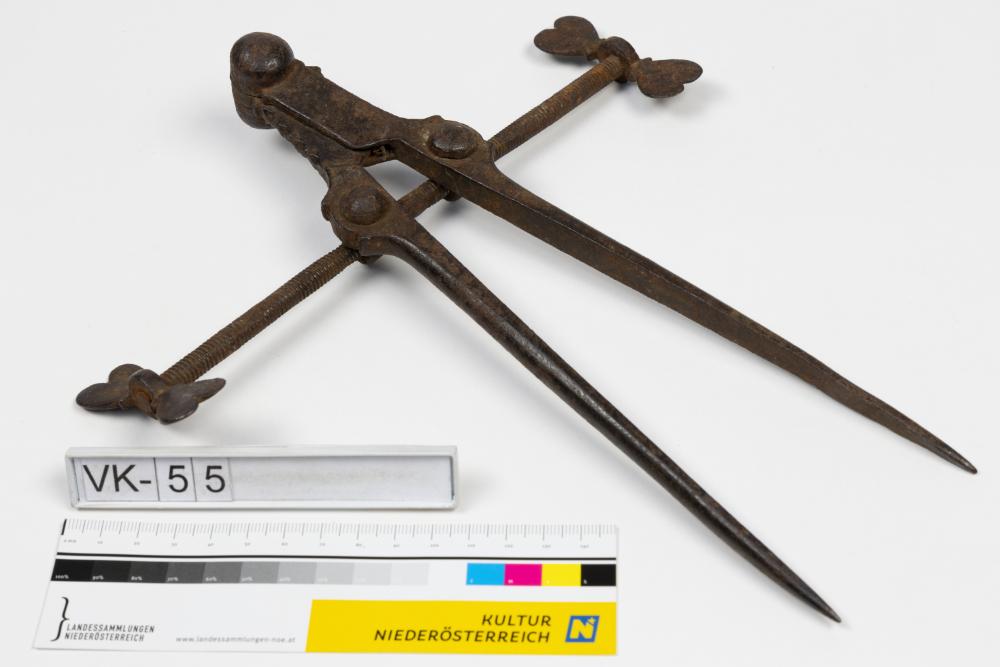 Eisenzirkel mit zwei Spitzen; zur Verstellung ist eine Gewindestange mit zwei Flügelmuttern angebracht.