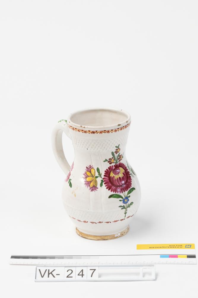 Bauchiger Majolika-Krug mit unterrandständigem Henkel und mehrfärbiger Bemalung: Eine große rote Blüte mit Blattwerk und weitere kleinere Blumen.