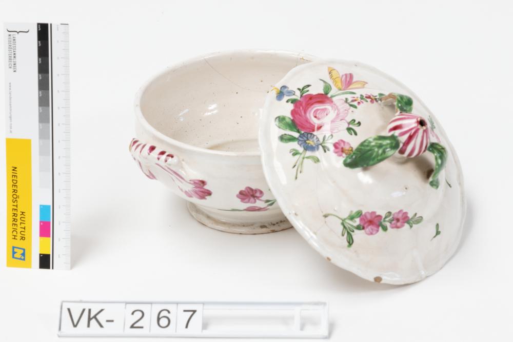 Weiß glasierte Schüssel mit zwei Henkeln (VK-267a) und einem Deckel mit Griff (VK-267b): Der Griff des Deckels ist als Blütenknospe mit drei frei stehenden und an den Spitzen den Deckel berührenden Blättern gestaltet. Deckel und Schüssel sind mit großen Rosenblüten und weiteren Blumendarstellungen mehrfärbig bemalt.