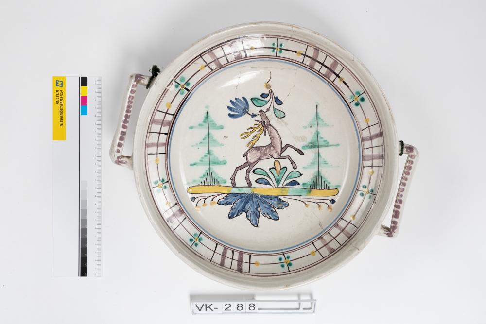 Majolika-Schüssel mit zwei Henkeln und mehrfärbiger Bemalung: Ein springender Hirsch im Wald auf dem Spiegel.