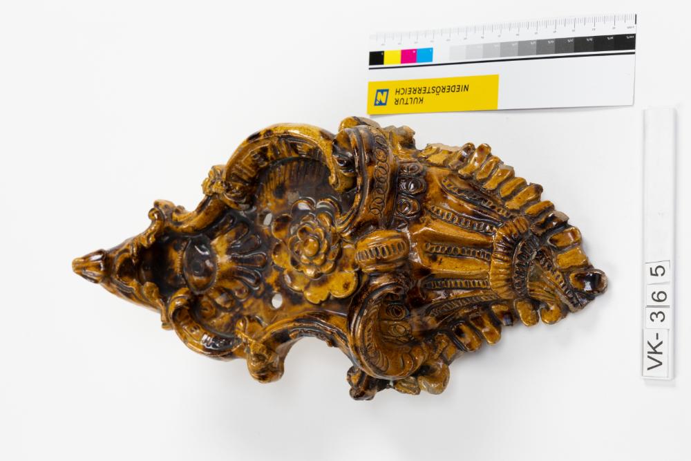 Stark ornamental verzierter Weihbrunnkessel mit der Darstellung einer Blüte und eines Auges, in verschiedenen Brauntönen glasiert.