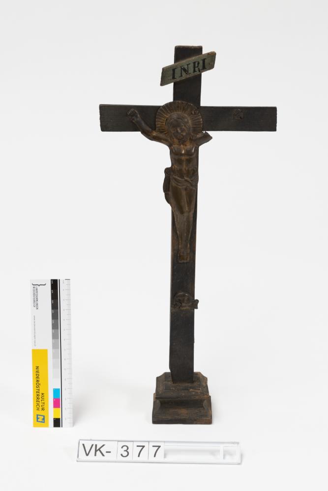 Kruzifix aus Holz mit aus Messing getriebenen Elementen.