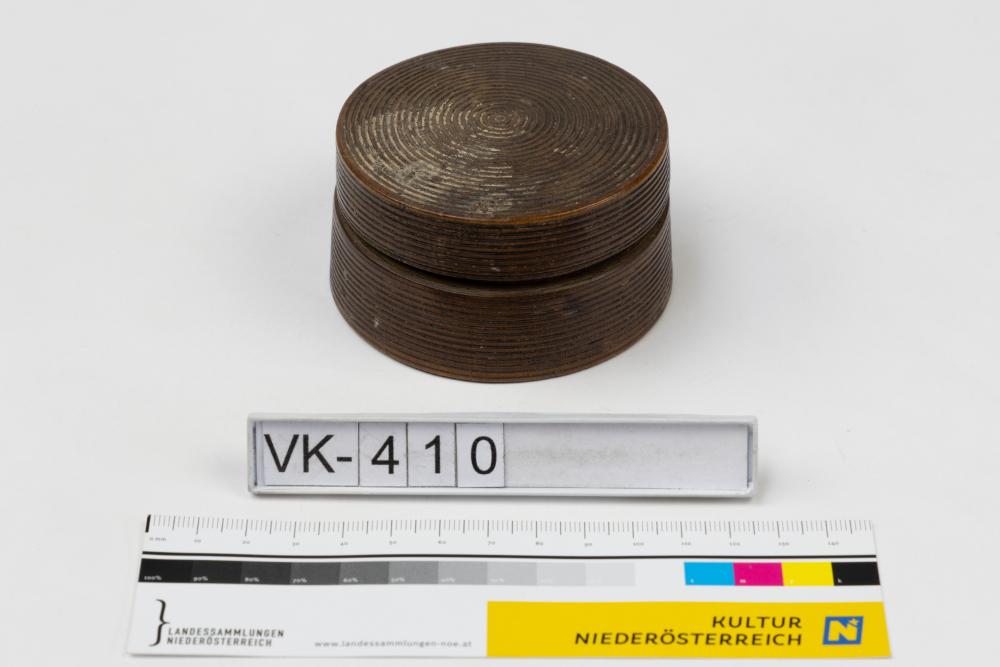 Hölzerne Dose mit Schraubdeckel und konzentrischen und umlaufenden Rillen.