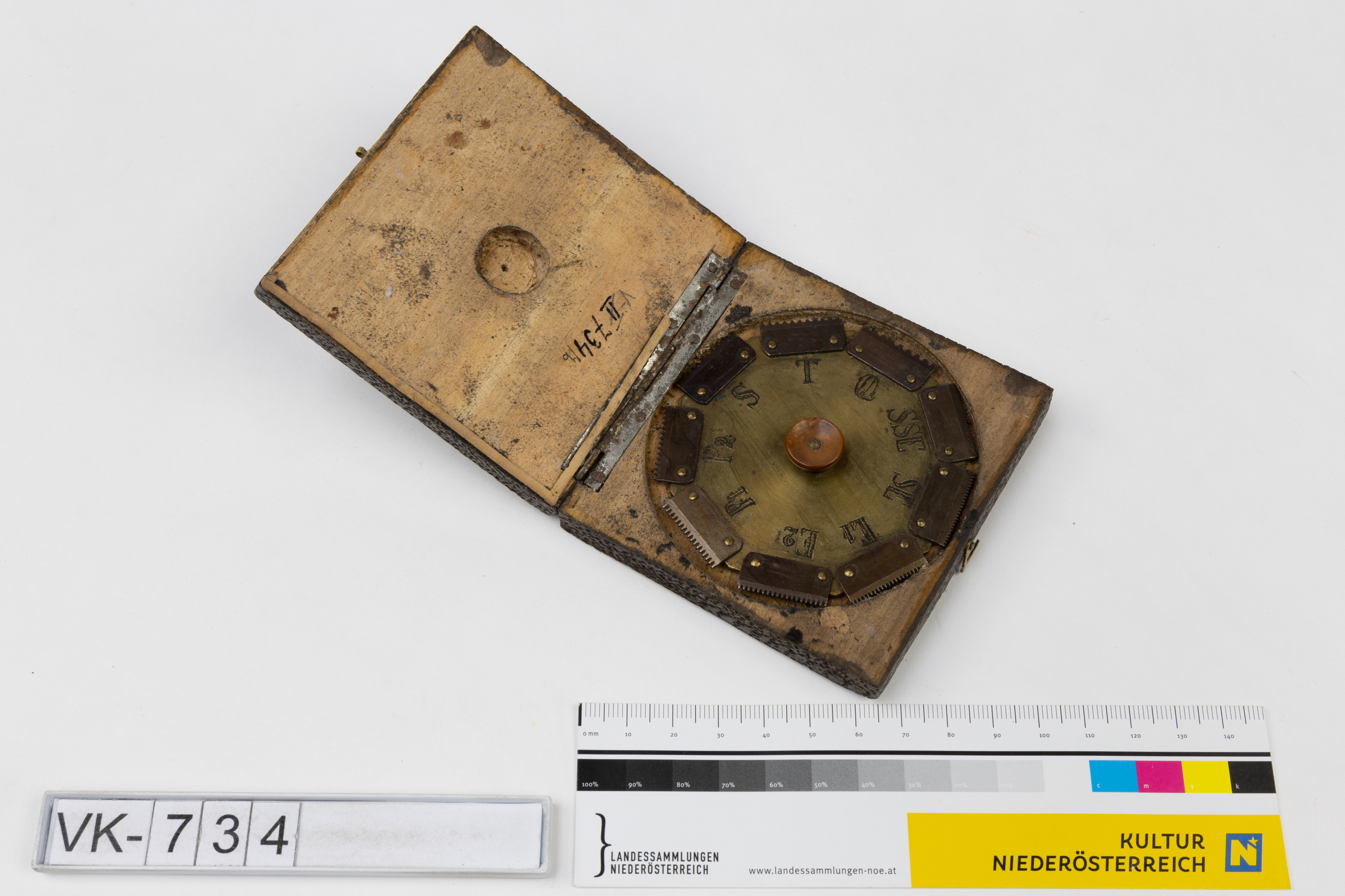 Runde Messingplatte mit neun aufgenieteten Gewindelehren und einem Holzknauf (VK-734a) in einer passenden Holzschachtel (VK-734b).