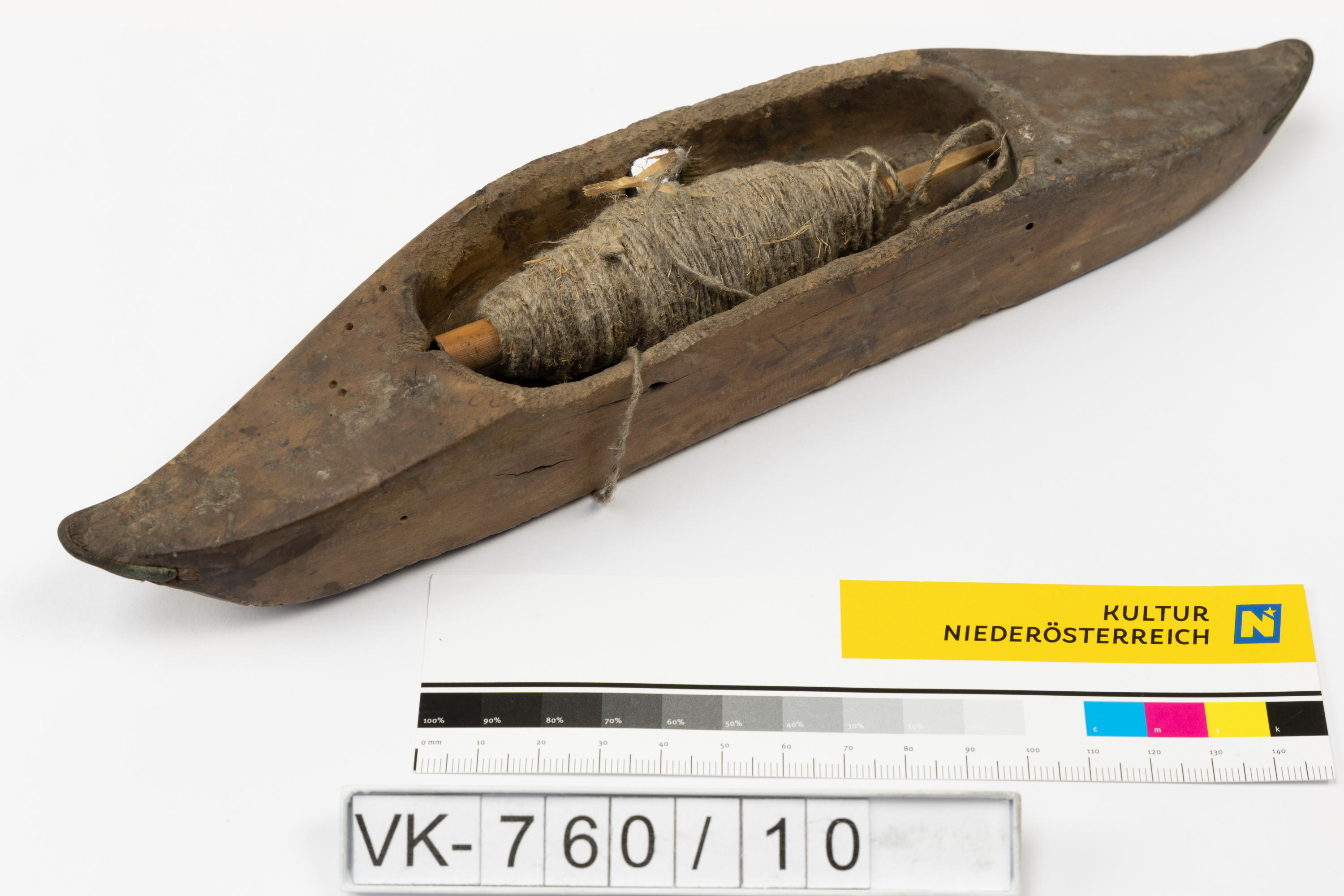 Webschiffchen mit Ausnehmung, Achse und Spule.
