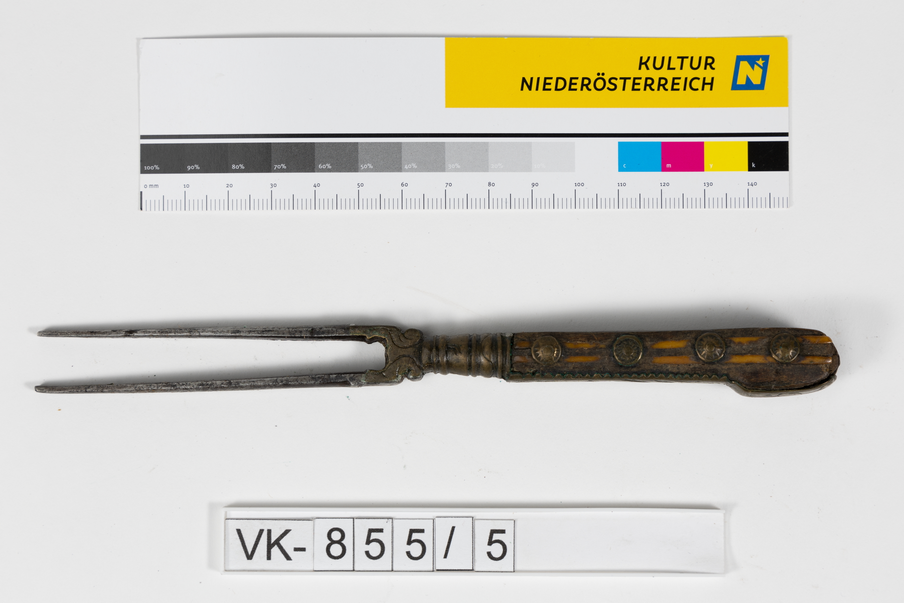 Zweizinkige Obstgabel mit verziertem Messinggriff, auf den zwei Horngriffschalen mit je zwei hellen Streifen mit Ziernieten aufgenietet sind.