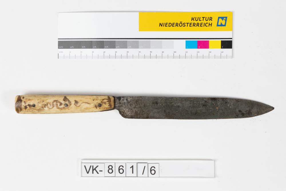 Spitzes Messer mit gerader Klinge, schmalem Rücken und ovalem, zum Ende hin leicht verbreiterten Griff mit verzierten Hornschalen. Auf der Klinge ist der Buchstabe "K" oder "R" eingeschlagen.