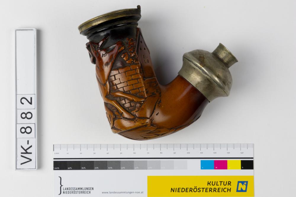 Großer Pfeifenkopf mit Messingdeckel und einem silbernen Holmring. Der zylindrische Pfeifenkopf ist zu einem Relief beschnitzt und zeigt einen laufenden Hirschen vor einem Haus. Im unteren Bereich des Kopfes ist die Datierung "1791" eingeschnitzt.
