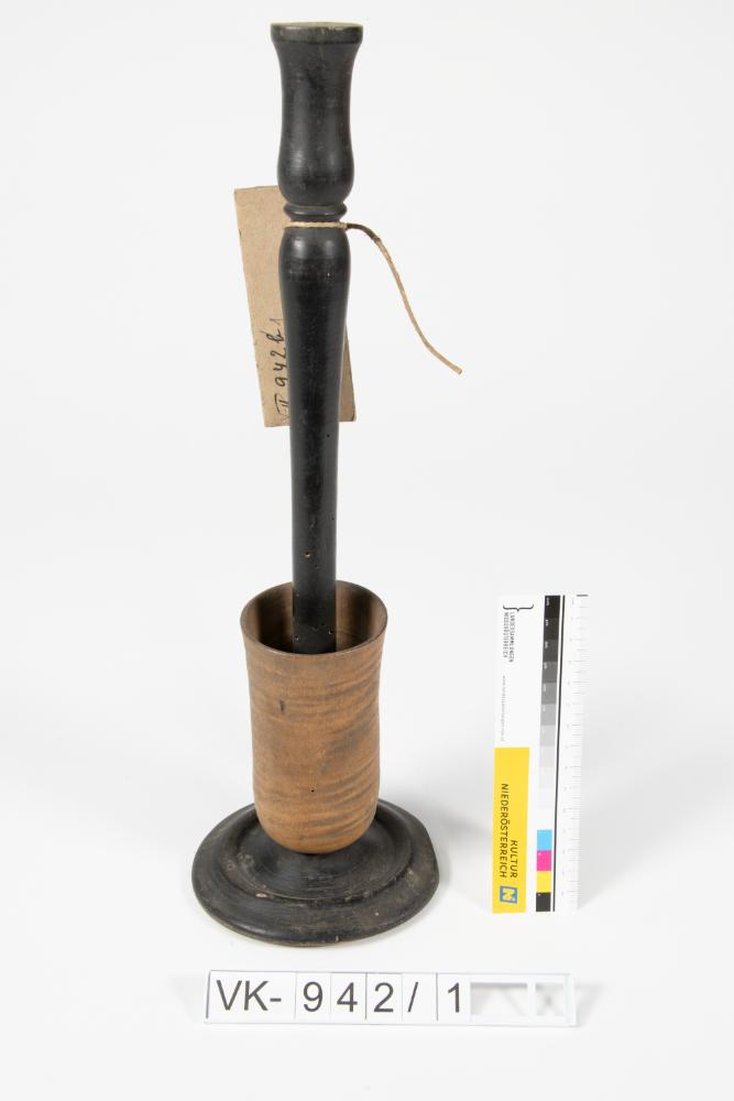 Hölzerner Kerzenständer für eine Kerze; im Bereich des Fußes ist ein becherförmiges Element angebracht, das als Fidibusbehälter diente. Der Leuchter stammt aus einem Haus, das in der 1. Hälfte des 19. Jahrhunderts ein Gasthaus war.