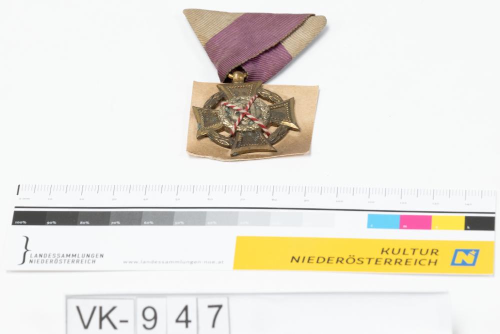 Veteranenabzeichen (Veteranenkreuz) aus Messing mit rot-weißem Stoffband.