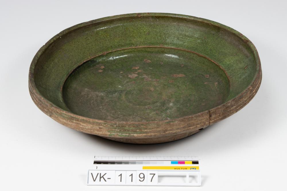 Große, innen grün glasierte Schüssel, ein Riss ist mit einem Stück Draht repariert.
