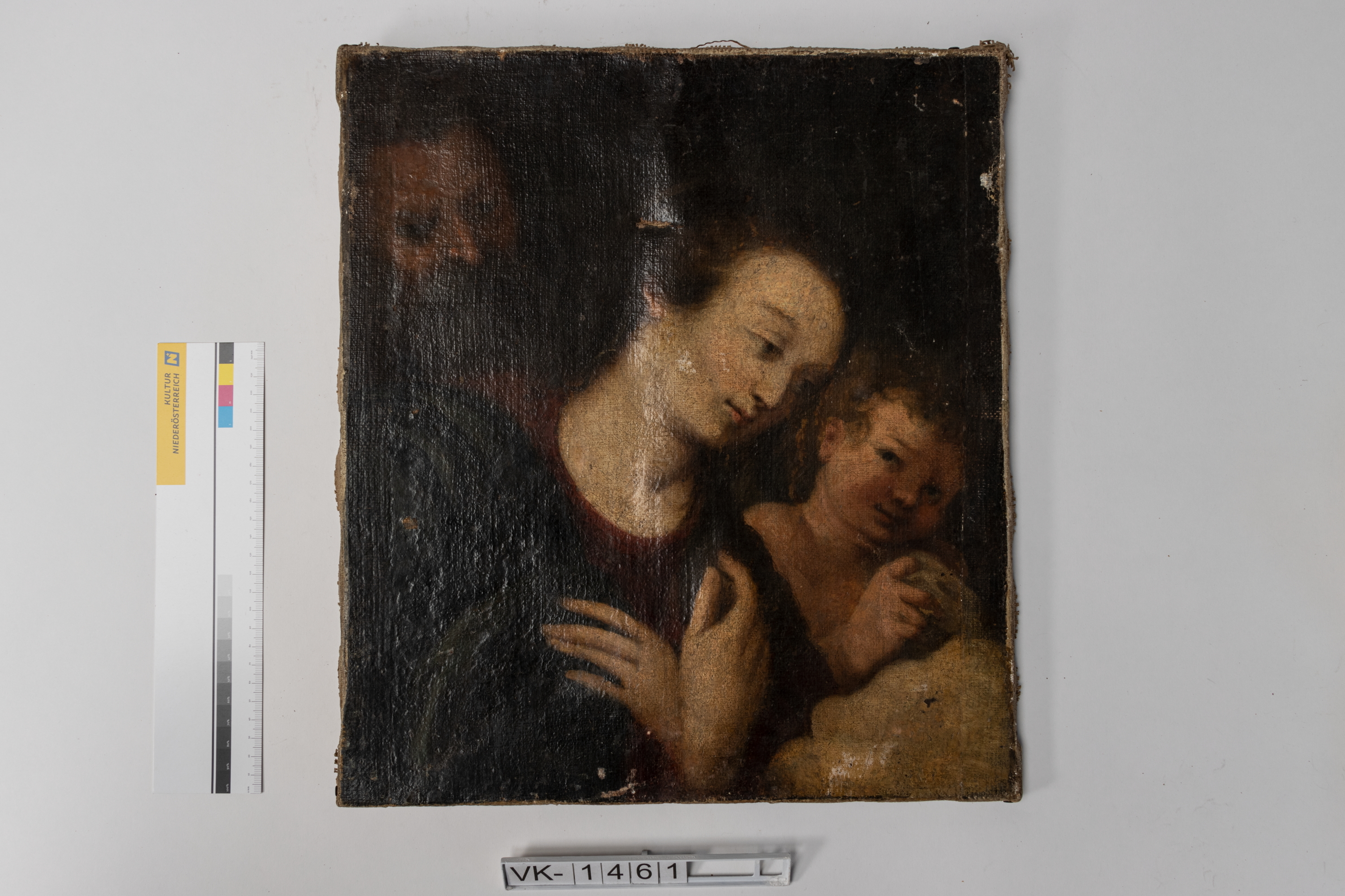 Ölmalerei auf Leinwand: Darstellung von drei Personen (vermutlich Hl. Familie).