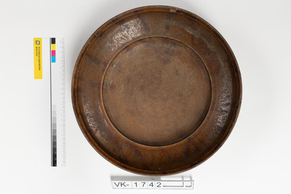 Teilweise glasierte Schüssel mit umlaufenden Rillen außen am Rand.