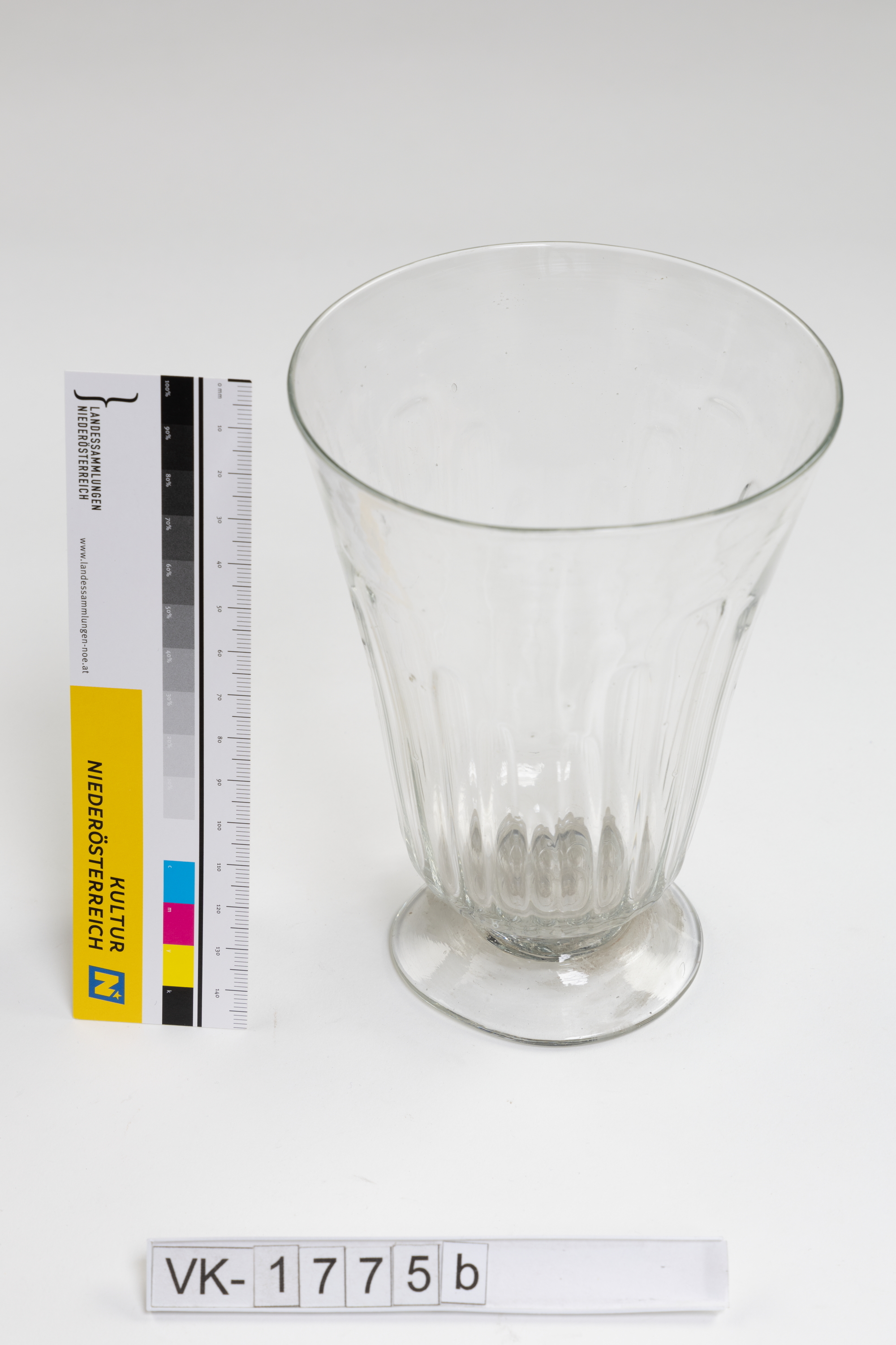 Konisches Glas mit abgesetzter Fußzone und umlaufenden vertikalen Einbuchtungen.