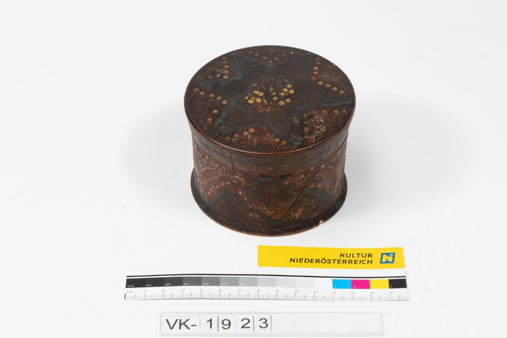 Kleine gedrechselte Godendose mit Schraubdeckel und mehrfärbiger Bemalung: Verschiedene Muster, am Deckel ein sechszackiger Stern.