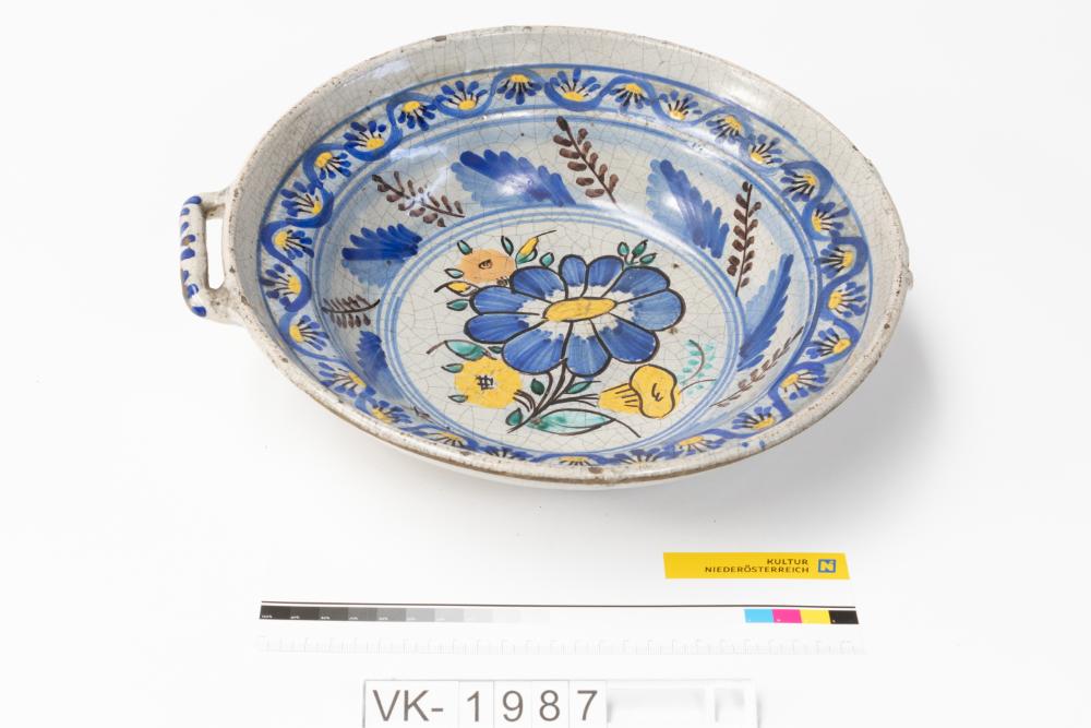 Schüssel mit grauer Glasur und mehrfärbigem Dekor (eine große und drei kleine Blüten am Spiegel, Blätter auf der Wandung und eine Wellenlinie mit Blüten auf der Fahne) und einem unterrandständigen Henkel.