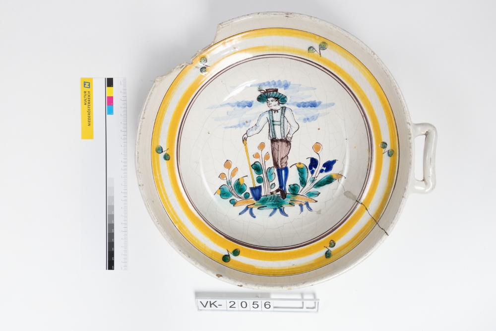 Weiß glasierte Schüssel mit einem Henkel und mehrfärbiger Bemalung: Umlaufende Linien und kleine Blättchen auf der Fahne, ein Bauer mit Hut und Schaufel mit Pflanzen auf dem Spiegel.