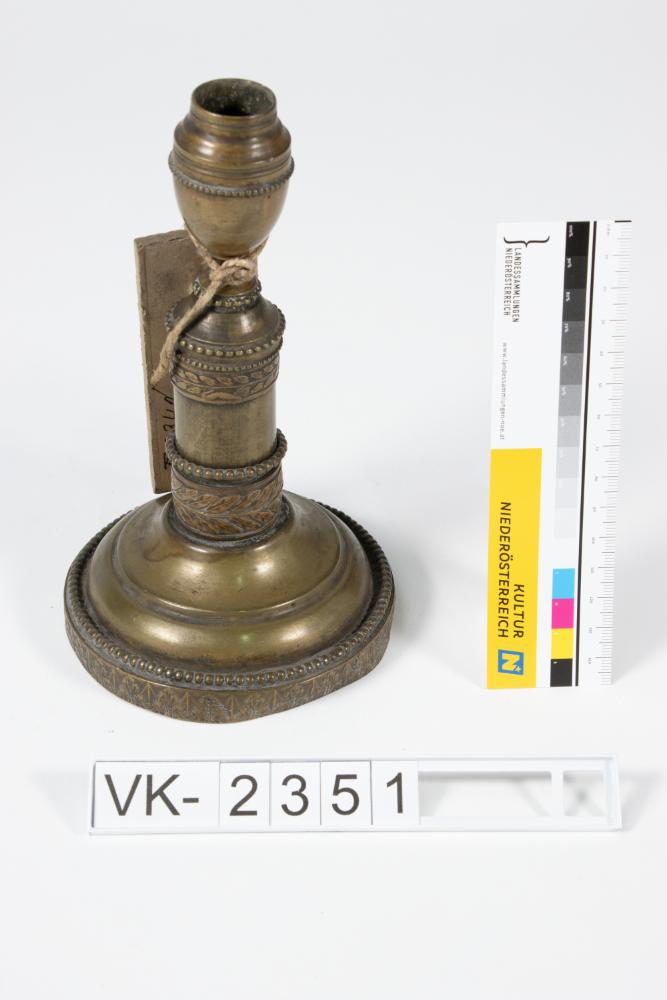 Kerzenständer für eine Kerze mit einem Standfuß mit geprägten Verzierungen. Der Kerzenständer ist aus Messingblech gefertigt.
