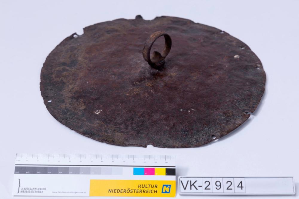 Runder flacher Metalldeckel mit einem verschraubten gusseisernen ovalen Griff, der im unteren Bereich eine Erhebung aufweist.