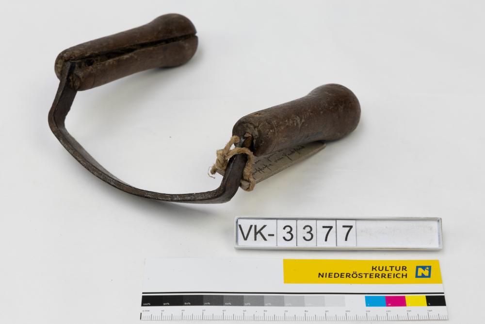 Reifmesser mit annähernd gerader Klinge und zwei Holzgriffen.