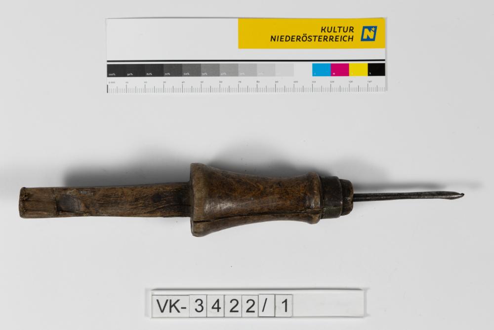 Schusterbohrer in einem Holzgriff mit vierkantiger Verlängerung (Aufnahme).