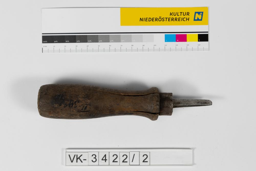 Schraubenzieher: Breiter Flachschraubenzieher in einem gedrechselten Holzgriff mit Metallverstärkung.