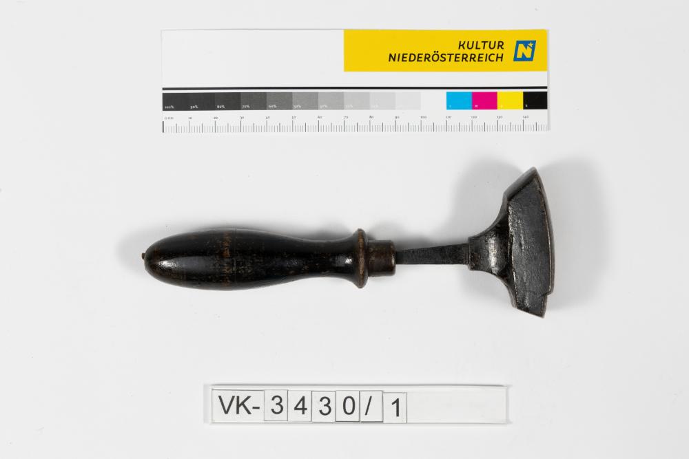 Trapezförmiger Absaztbolzen (Ambössl) mit gedrechseltem Holzgriff der mit einem Metallring verstärkt ist und am Ende eine Lederschlaufe angenagelt hat.