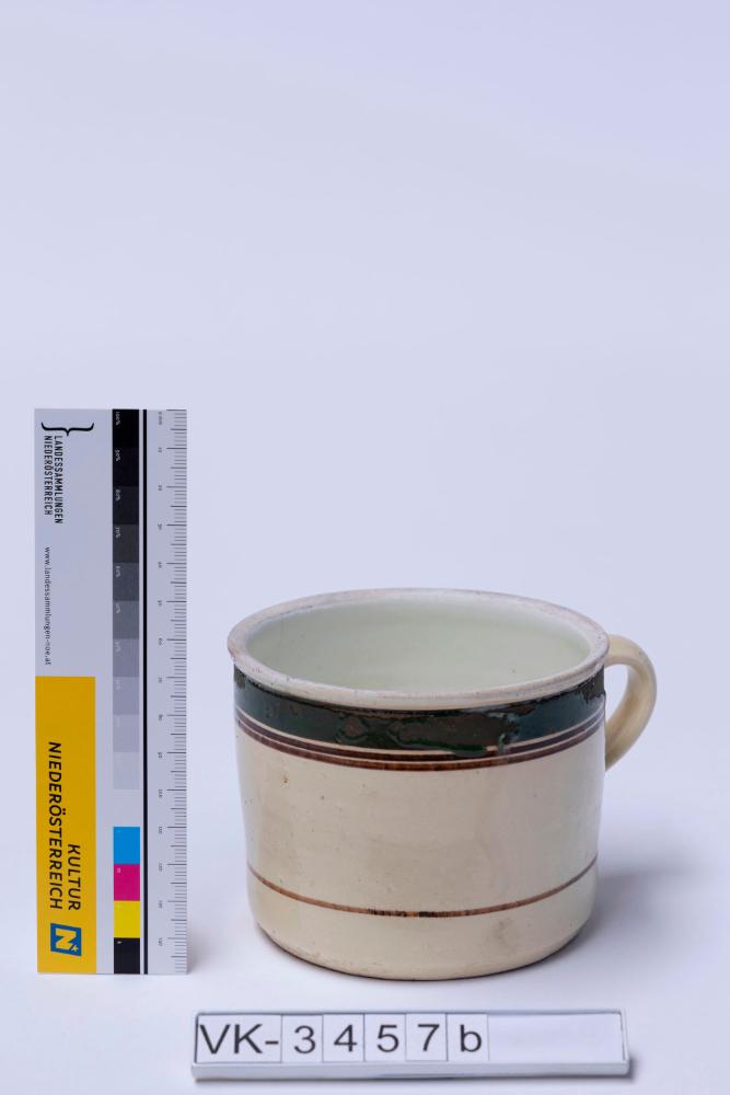 Innen weiß und außen beige glasiertes Häferl mit unterrandständigem Henkel und durch den Henkel unterbrochene Linien in braun (schmal) und dunkelgrün (breit). Aus der Fabrik Wilhelmsburg.