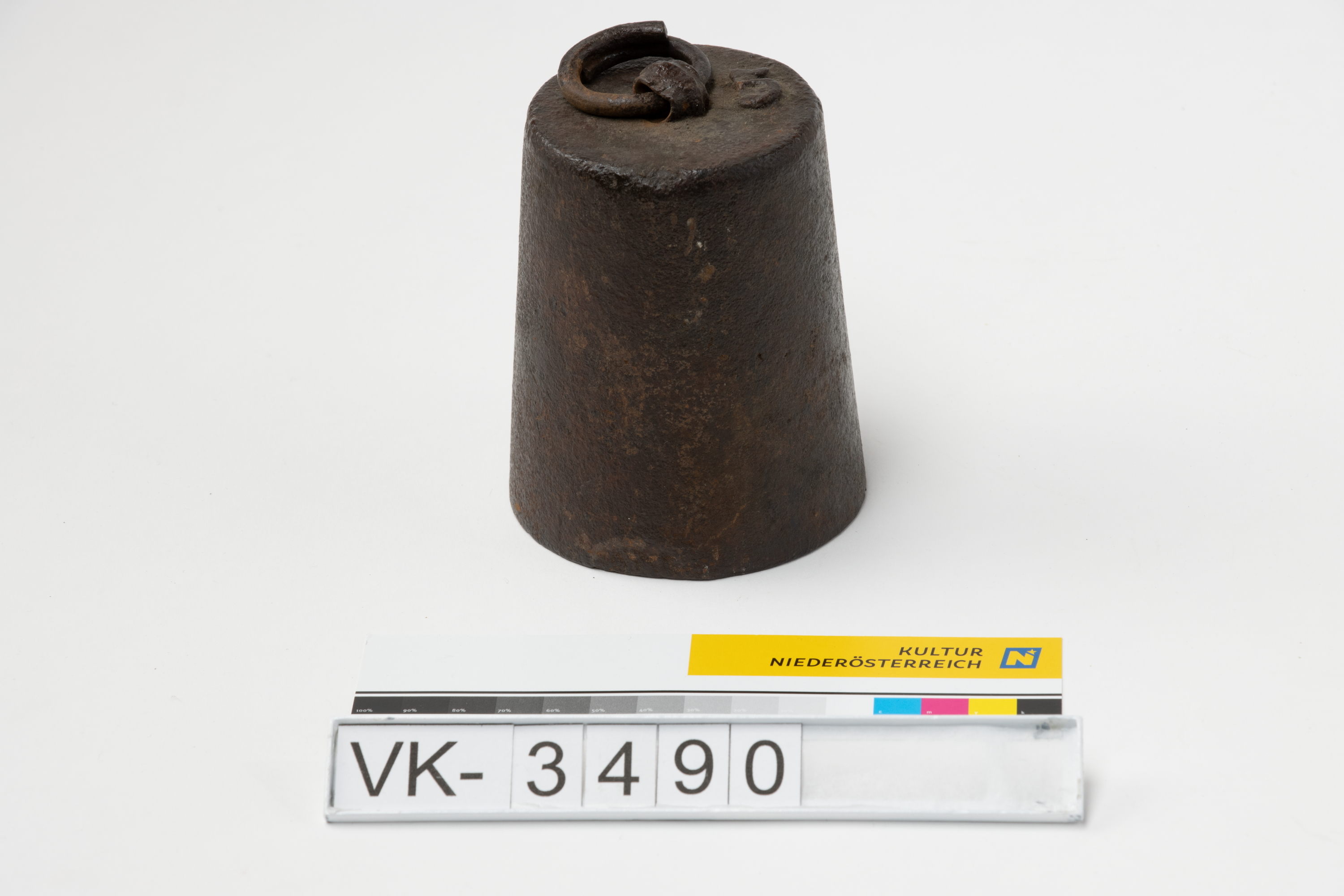 Zylindrisches, Eisengewicht mit Öse und Eisenring, auf dem Gewicht befindet sich die Zahl 5.