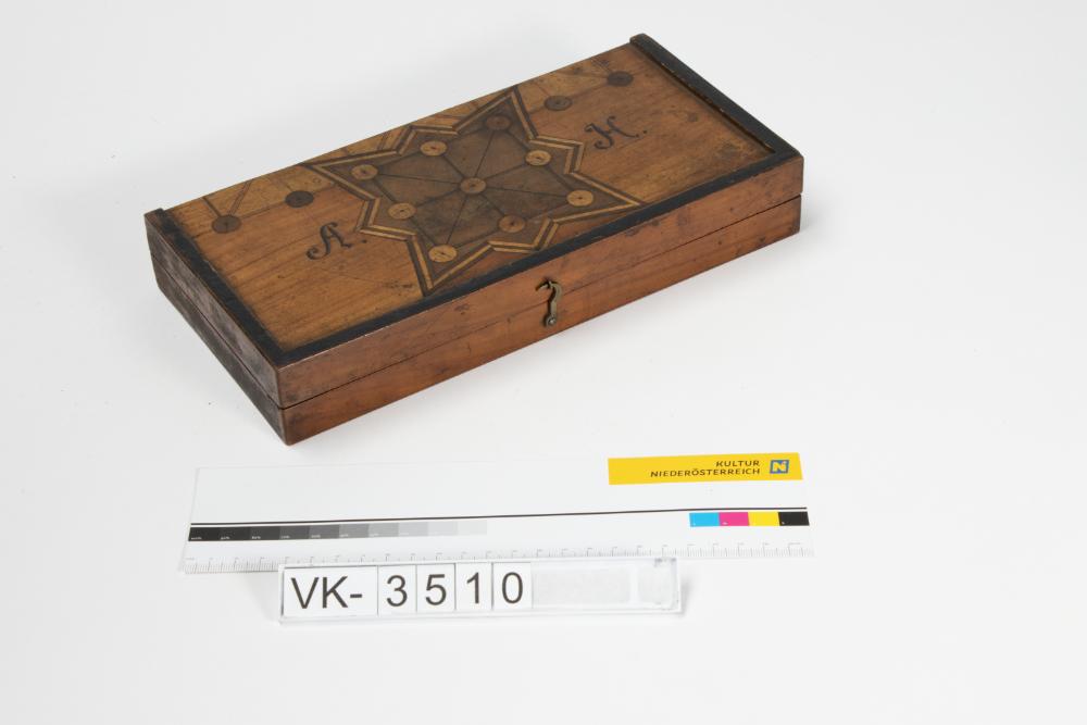 Brettspiel (möglicherweise Halma oder Solitär, laut Inventarbuch Dame) in einer Holzschachtel zum Aufklappen, in der die Spielsteine aufbewahrt sind. Die Außenflächen der Schachtel zeigen je ein halbes Spielfeld in Einlegearbeit und die Buchstaben: "AH".