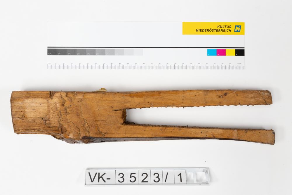 Holzzwinge aus einem grob beschnitzten, gabelförmig ausgeschnittenen Stück Holz aus der Werkstatt eines Korbflechters.