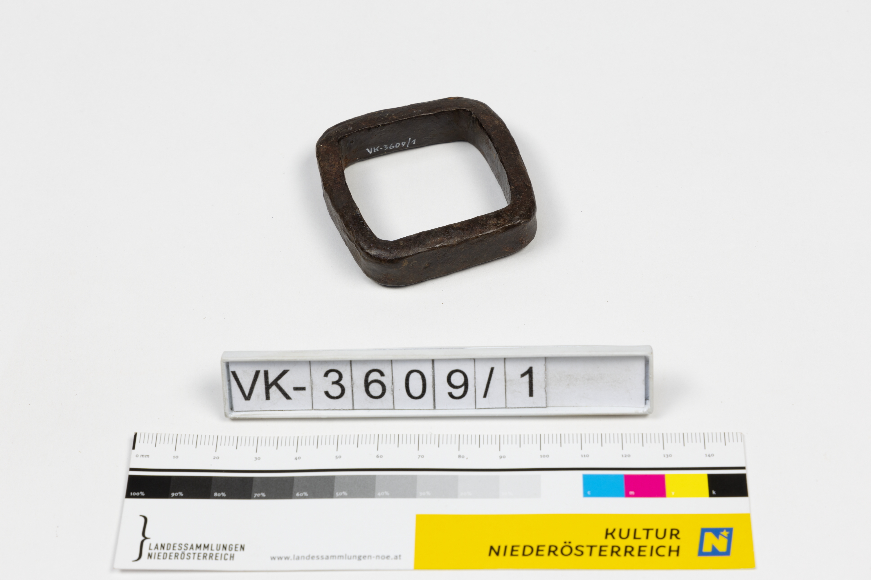 Annähernd quadratischer, schmiedeeiserner Sensenring.
