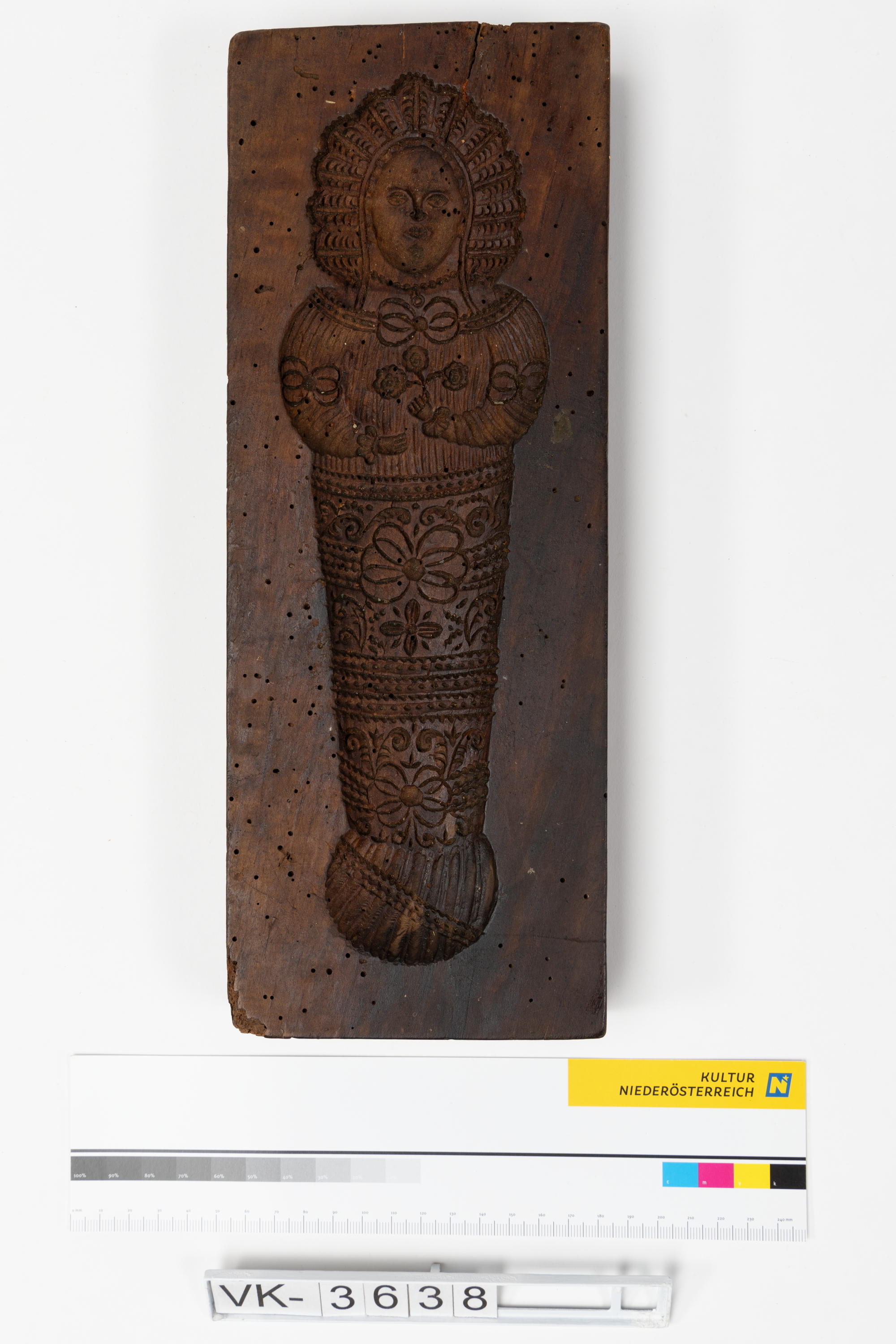 Quaderförmiges Model mit eingeschnitzten Negativformen auf zwei Seiten mit zwei unterschiedlichen Fatschenkind-Motiven. Auf einer Seite befinden dich die Initialen IR.