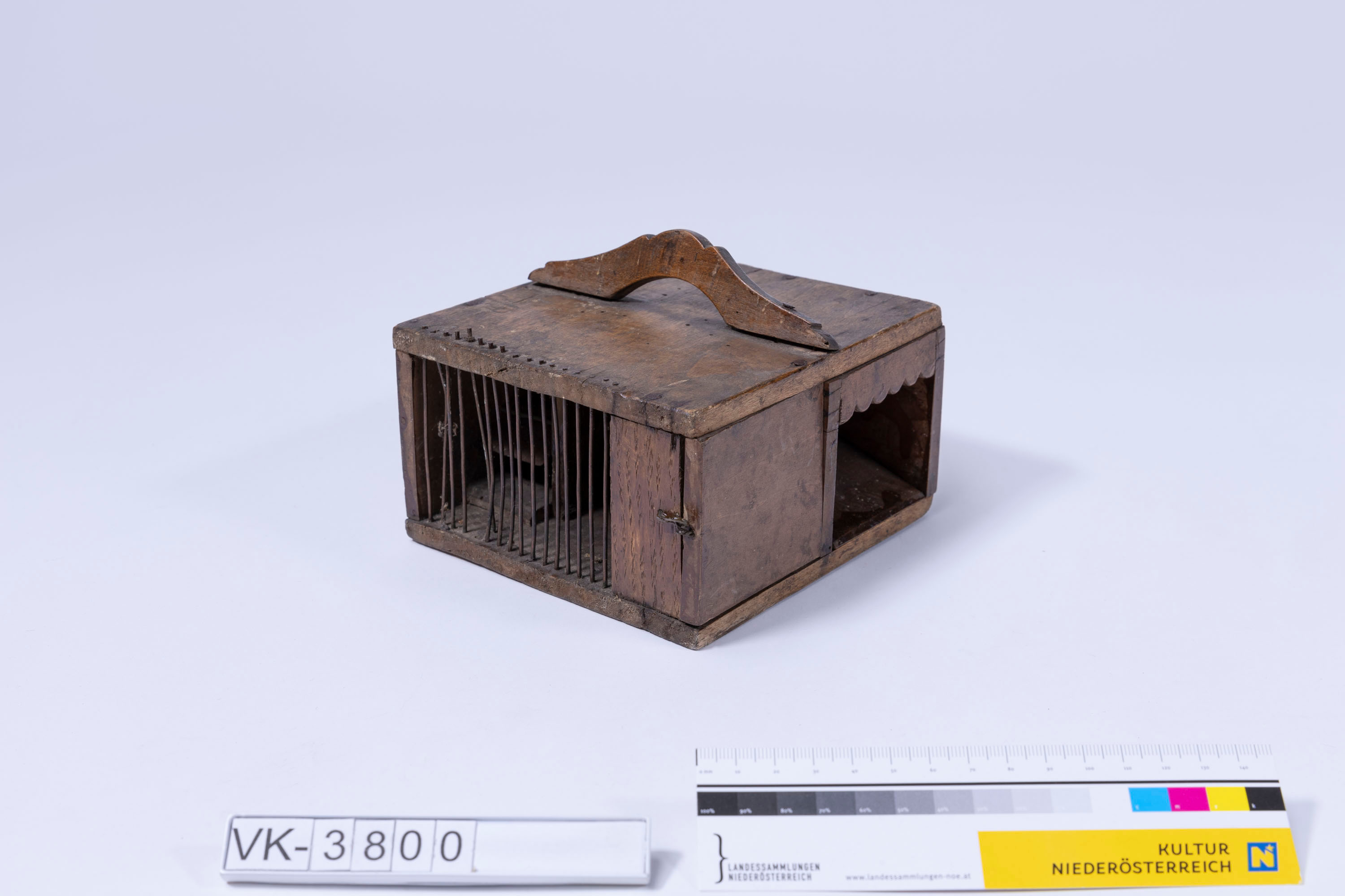 Mausefalle in einem quaderförmigen Holzgehäuse, teilweise vergittert. Die Falle hat oben einen Tragegriff und ist als Lebendfalle mit einer Klappe und einem Riegel gebaut.