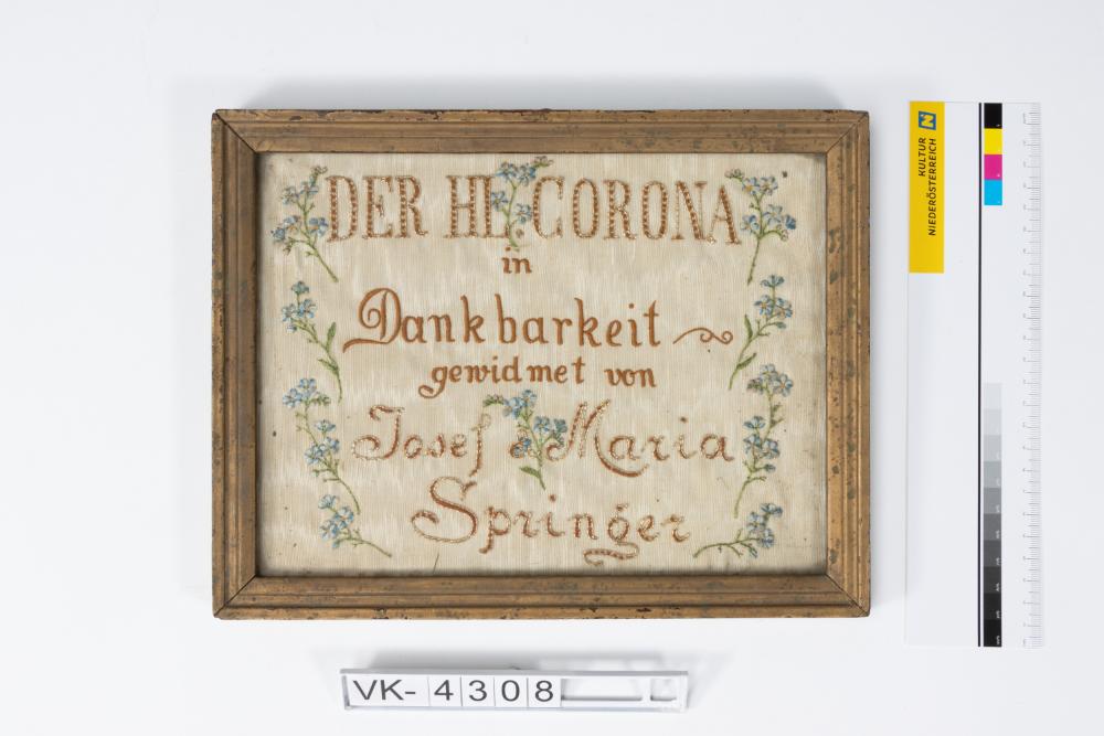 Stickerei hinter Glas in einem Holzrahmen: Vergissmeinnicht und braun-goldene Schrift "DER HL. CORONA in Dankbarkeit gewidmet von Josef und Maria Springer".