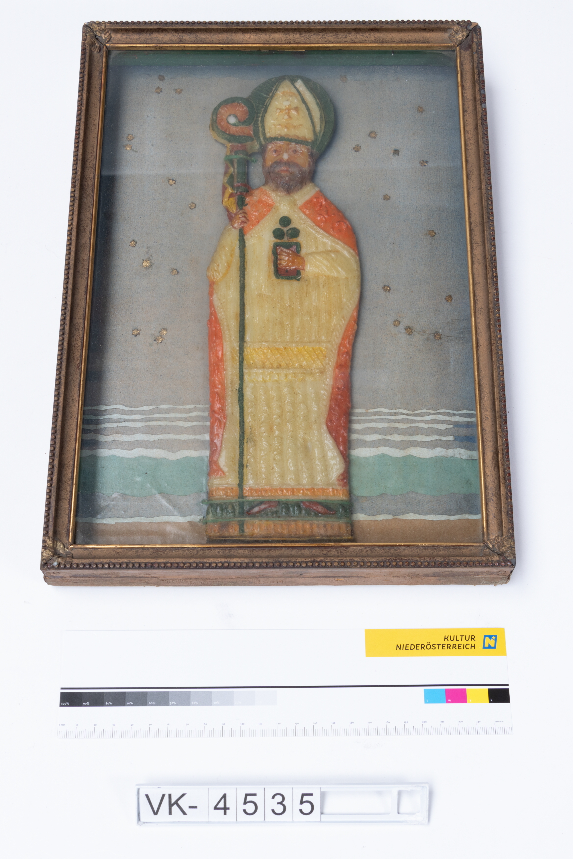 Kastenbild mit Wachsabguss einer Figur des Hl. Nikolaus vor einem gemalten Hintergrund in einem Holzrahmen hinter Glas.