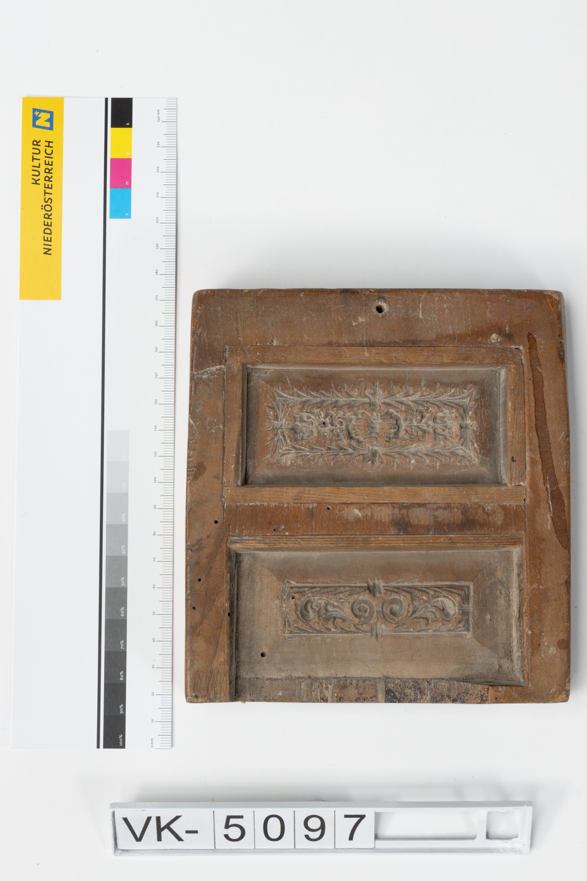 Beidseitig beschnitztes Lebzeltermodel aus Holz; auf der einen Seite befinden sich zwei rechteckige Motive mit ornamentalem Dekor, auf der anderen Seite ein halbes rechteckiges Motiv mit floralem Dekor.