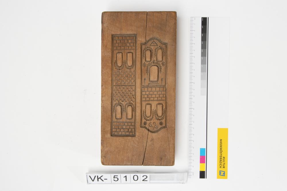 Lebzeltermodel mit eingeschnitztem Motiv: Bauteile für ein Hausmodell, in eine Schmalseite sind die Initialen "E. G." eingeschnitzt.