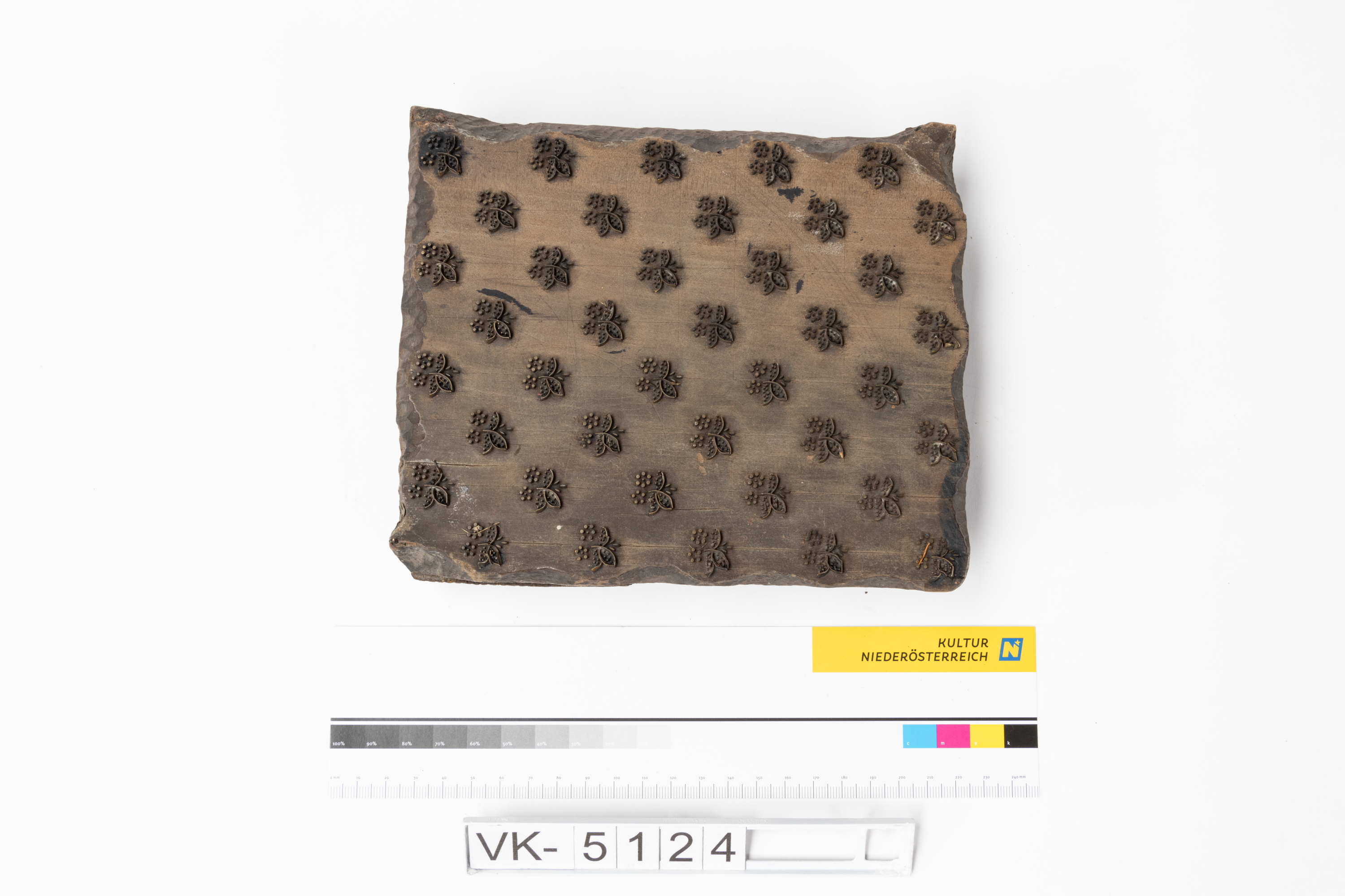 Färbermodel aus Holz mit Metallelementen auf einer Trägerplatte mit zwei Kerben. Druckmuster: Kleine florale Elemente.
