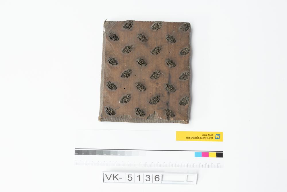 Färbermodel aus Holz mit Metallelementen. Druckmuster: Kleine Blattelemente.