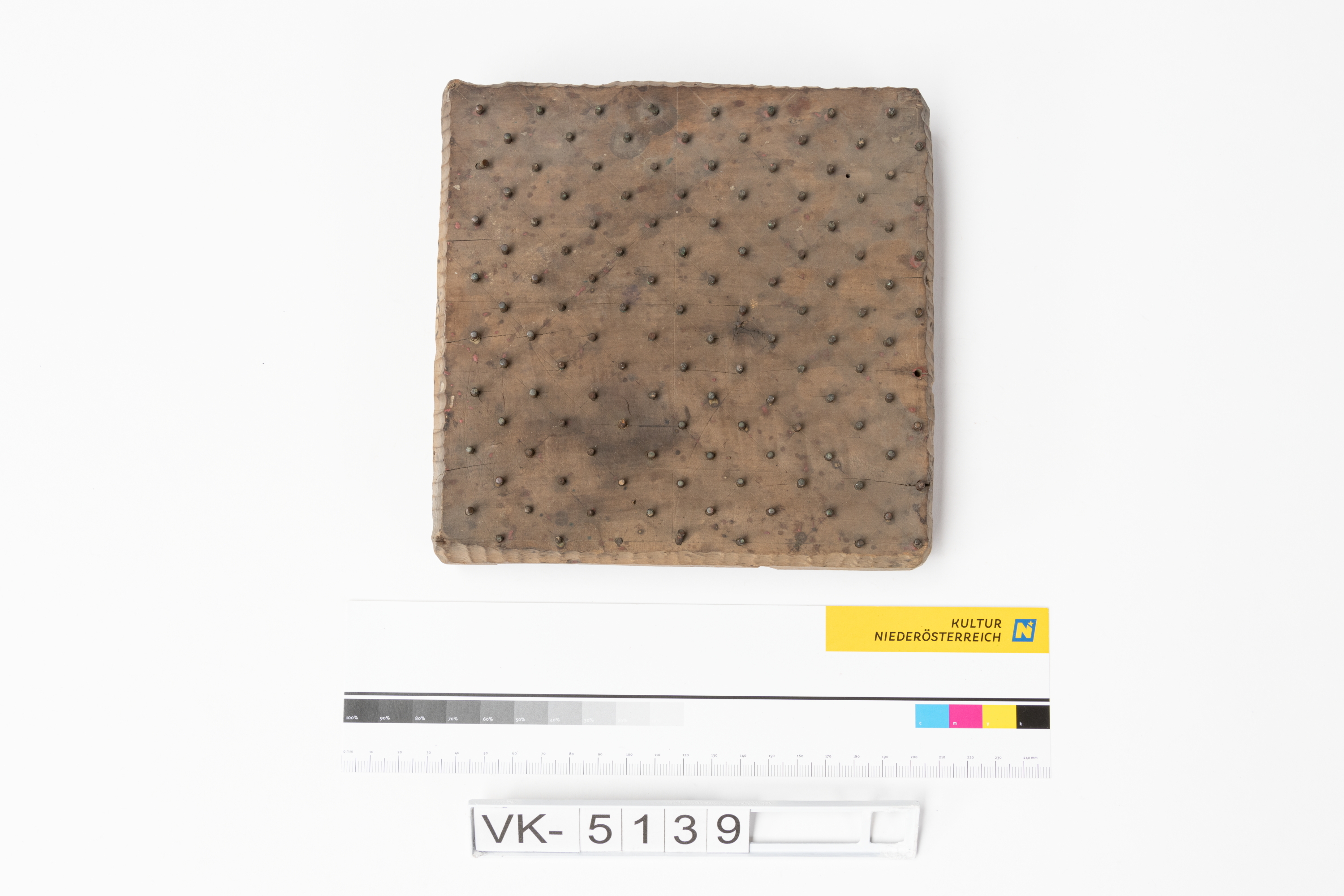 Färbermodel aus Holz mit Metallstiften und zwei Kerben. Druckmuster: Punkte.