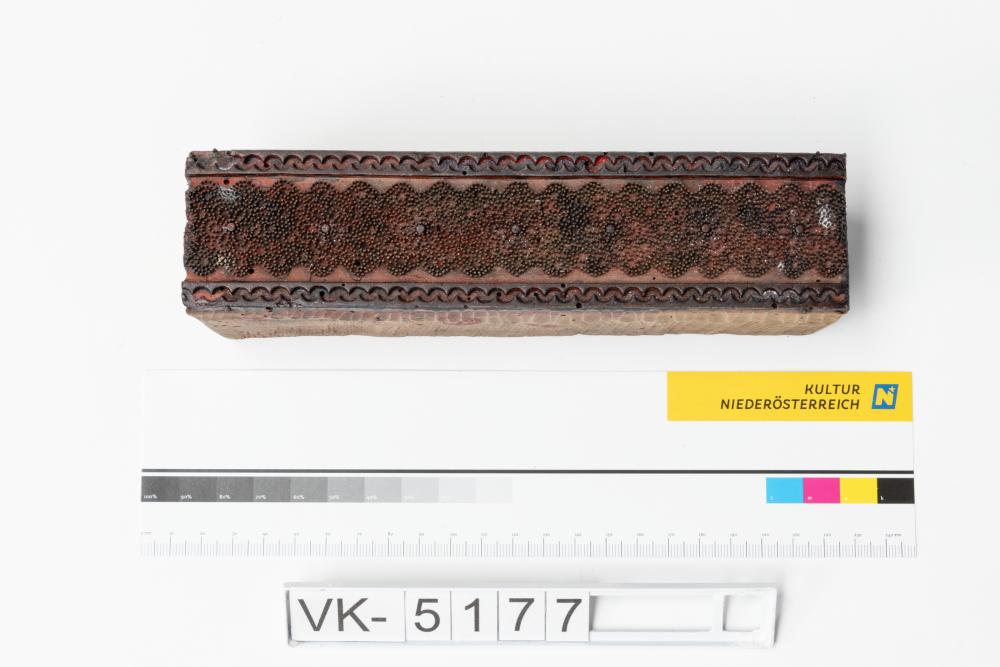 Längliches Färbermodel aus Holz mit Metallstiften und zwei Kerben. Druckmuster: Borte, mit Resten roter Farbe.