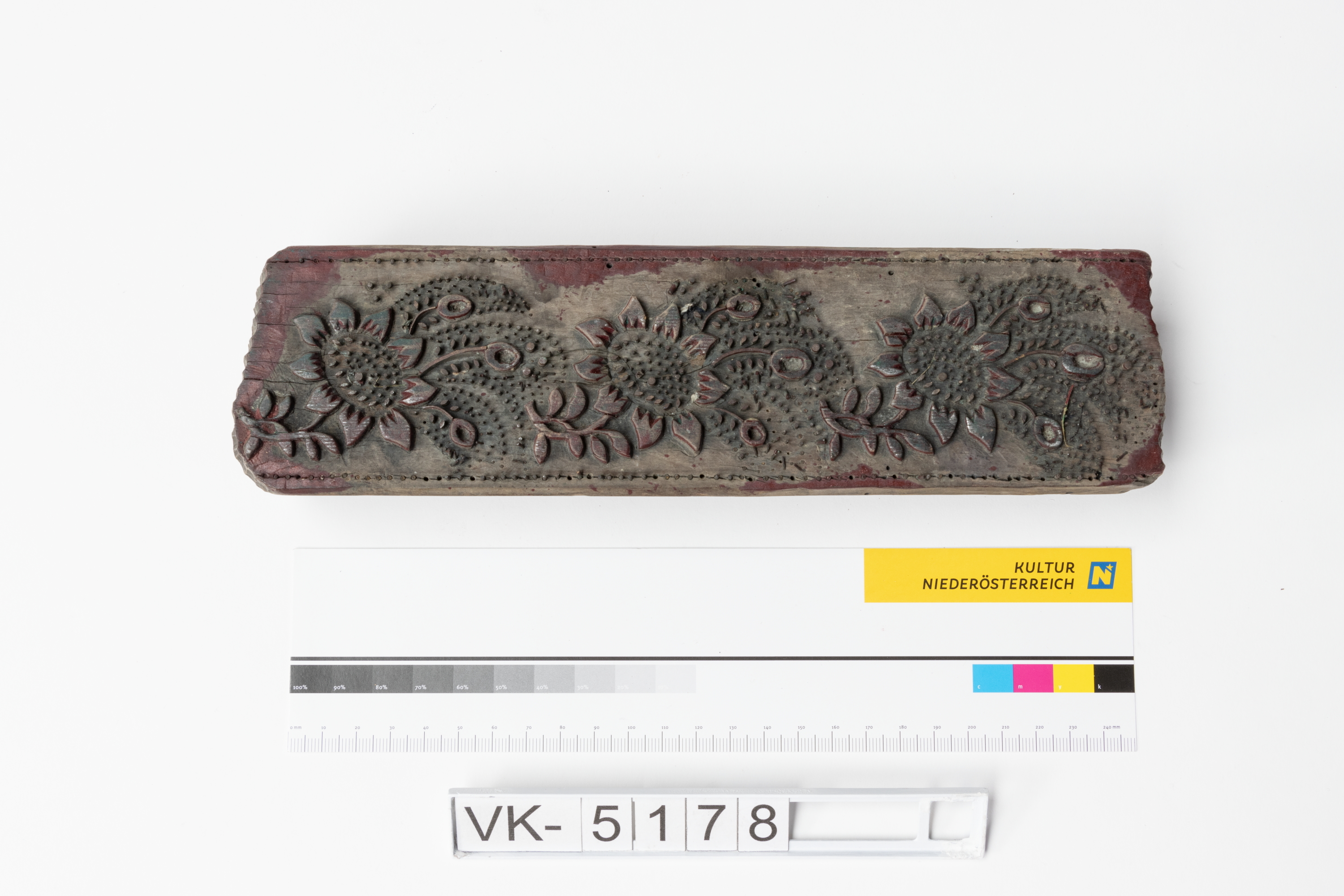 Längliches Färbermodel aus Holz mit Metallelementen und zwei Kerben. Druckmuster: Große Blüten mit Blattwerk, mit Resten roter Farbe.