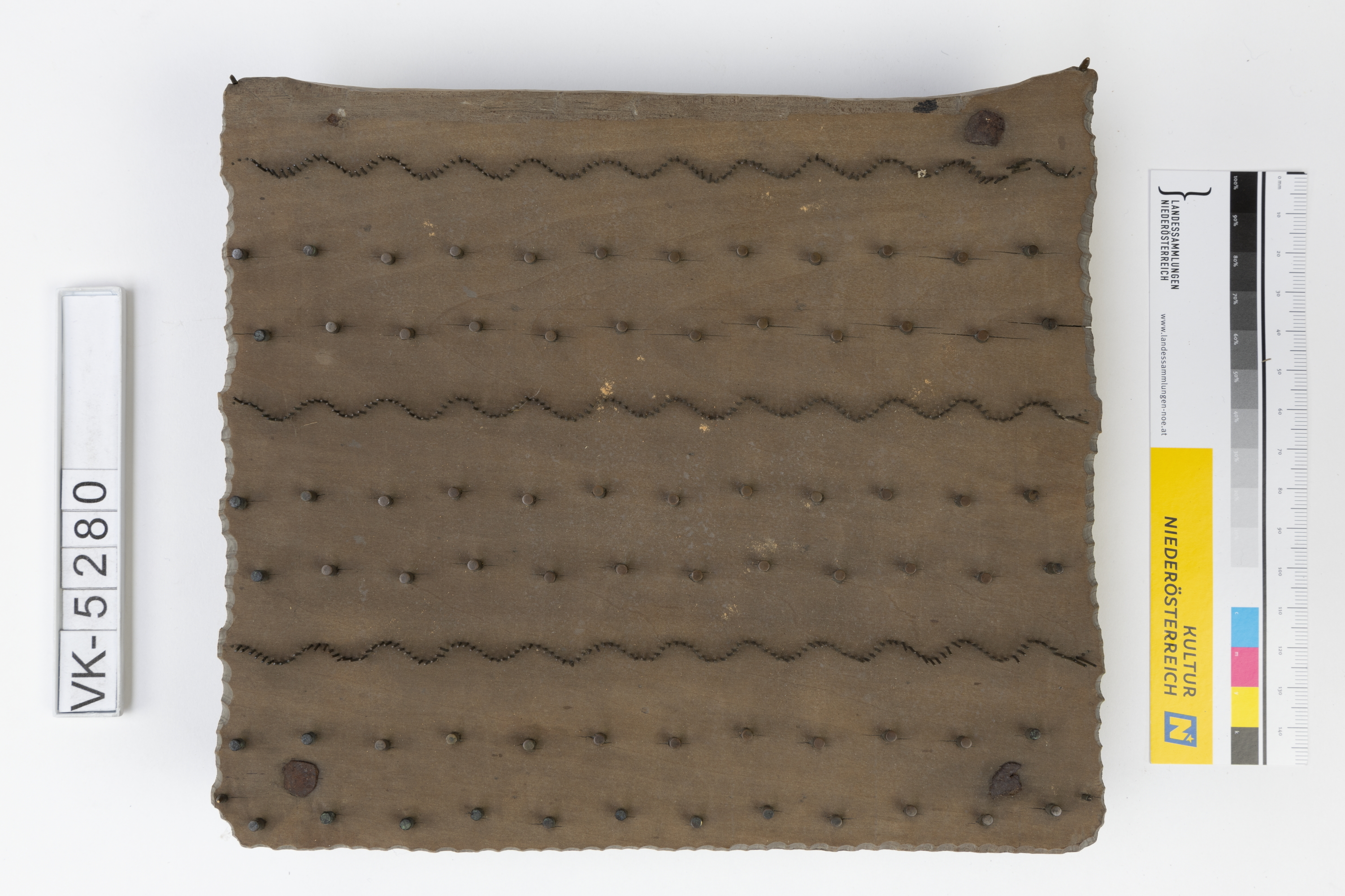 Färbermodel aus Holz mit Metallstiften auf einer Trägerplatte mit zwei Kerben. Druckmuster: Gepunktete Linien, abwechselnd gerade und wellenförmig, (Muster Nr. 127 des Druckers).