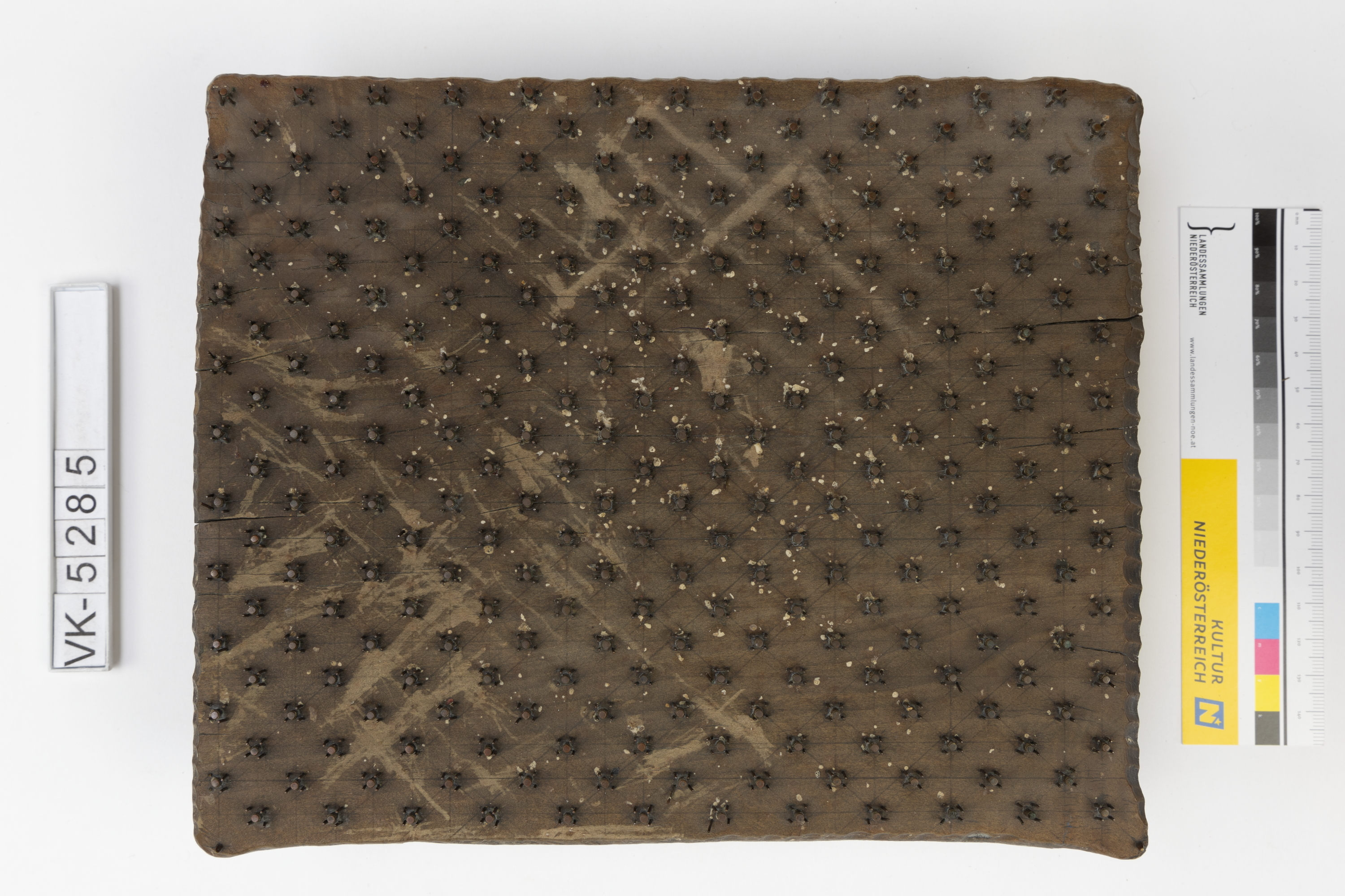 Färbermodel aus Holz mit Metallstiften auf einer Trägerplatte mit zwei Kerben. Druckmuster: Elemente aus jeweils fünf Punkten, (Muster Nr. 109 des Druckers).