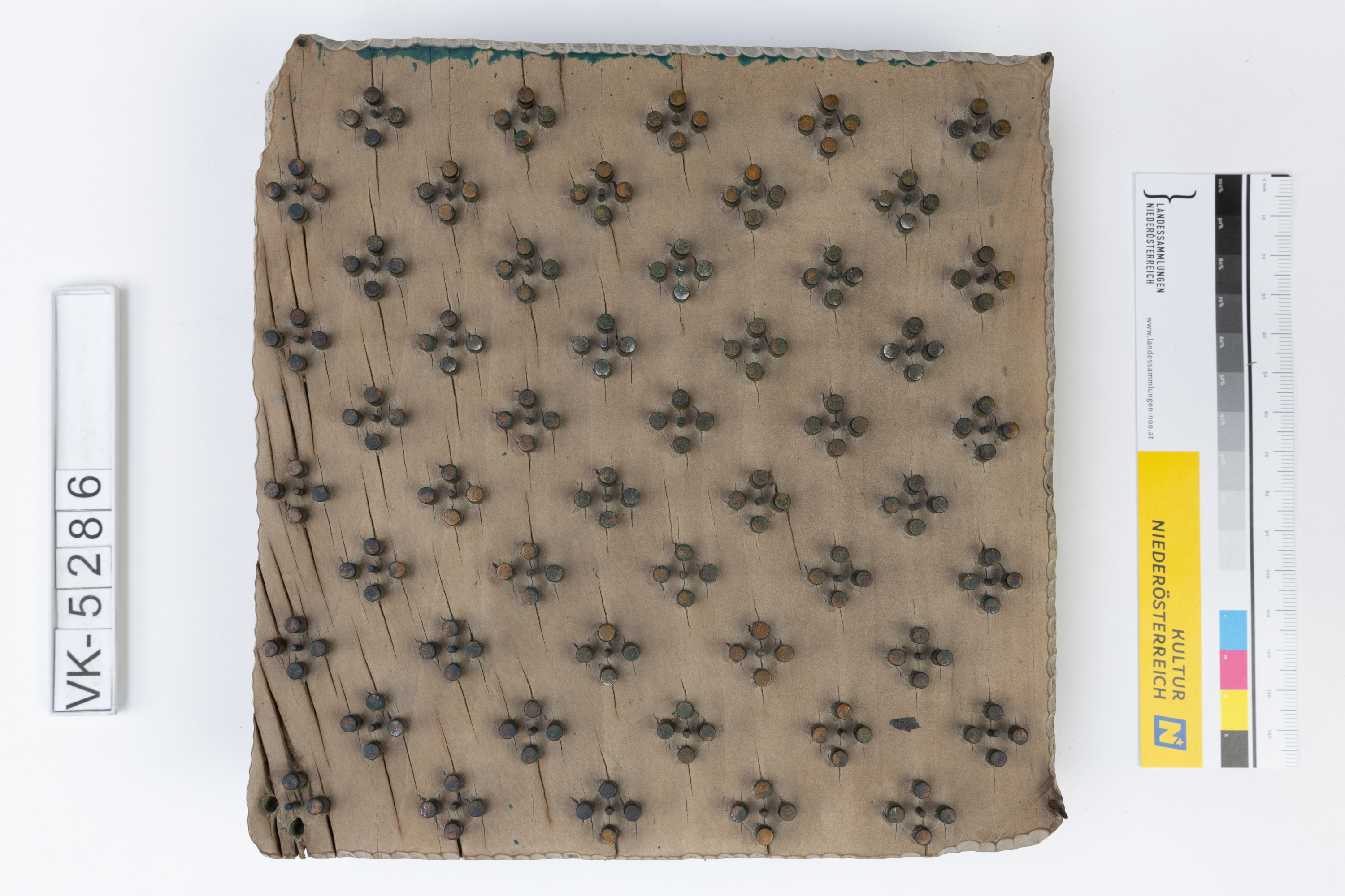 Färbermodel aus Holz mit Metallelementen auf einer Trägerplatte mit zwei Kerben. Druckmuster: Quadratische Elemente aus je fünf Punkten, (Muster Nr. 132 des Druckers).