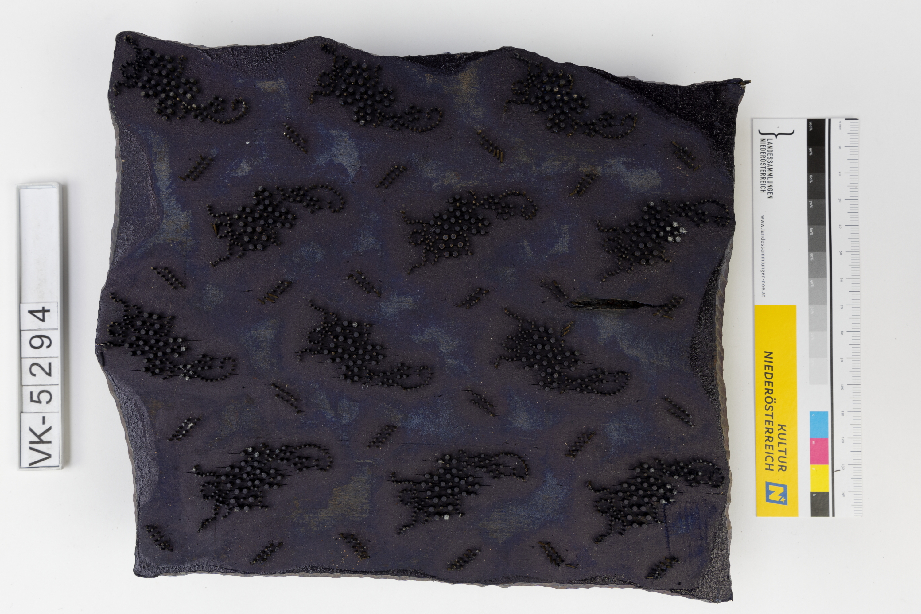 Färbermodel aus Holz mit Metallstiften auf einer Trägerplatte mit zwei Kerben. Druckmuster: Unterschiedlich große gepunktete Elemente, (Muster Nr. 174 des Druckers), mit Resten dunkelblauer Farbe.