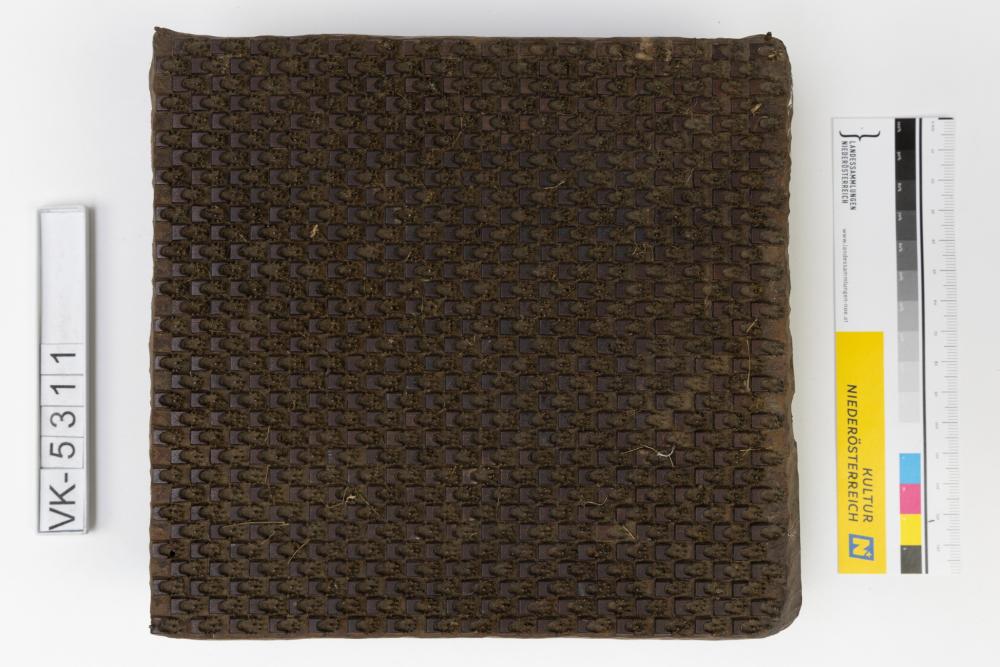 Färbermodel aus Holz mit Metallstiften auf einer Trägerplatte mit zwei Kerben. Druckmuster: C-förmige Elemente, (Muster Nr. 181 des Druckers), mit Resten dunkler Farbe.