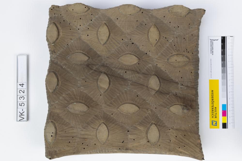 Färbermodel aus Holz mit Metallstiften an den Ecken auf einer Trägerplatte mit zwei Kerben. Druckmuster: Große Linsenformen (Muster Nr. 147 des Druckers).